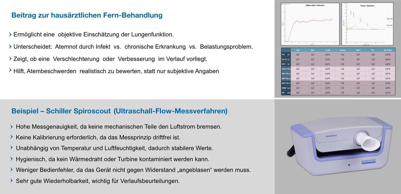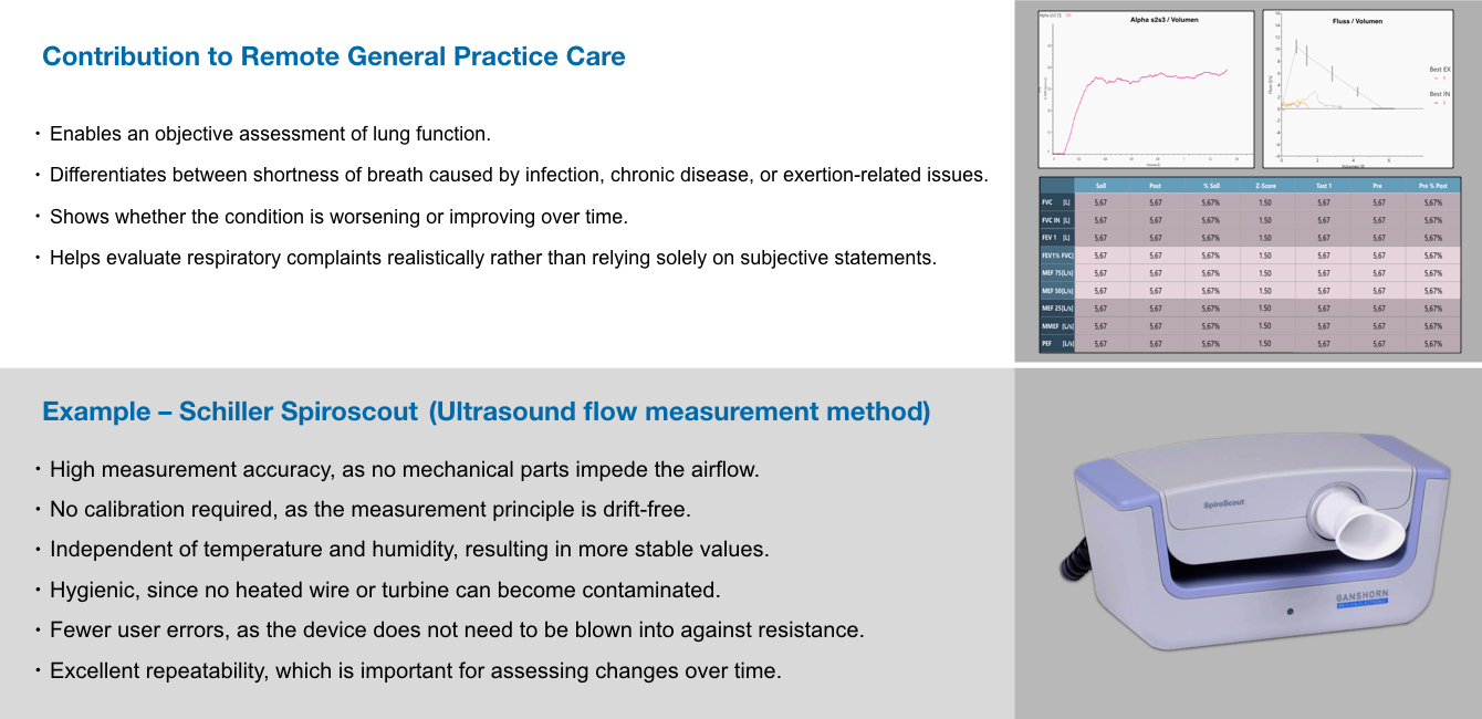 - Spirometer für die Lungenfunktionsprüfung zur Beurteilung der Lungenfunktion, etwa bei Atemwegserkrankungen oder Belastungsproblemen.