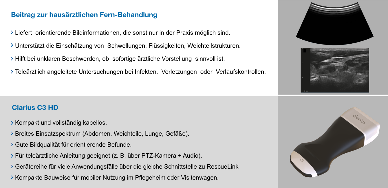 - Ultraschall Handgerät für orientierende Untersuchungen, zum Beispiel bei Weichteilen, Flüssigkeitsansammlungen oder Gefäßstrukturen.